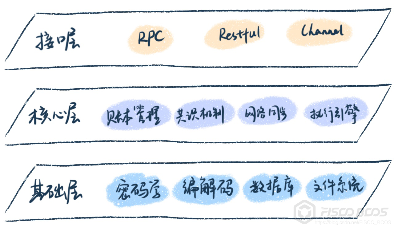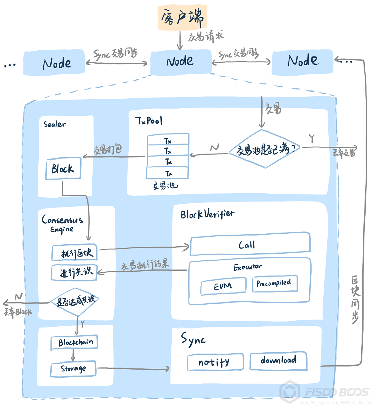 以FISCO BCOS为例,通过多个模块相互协作,完成交易整个生命周期的处理: