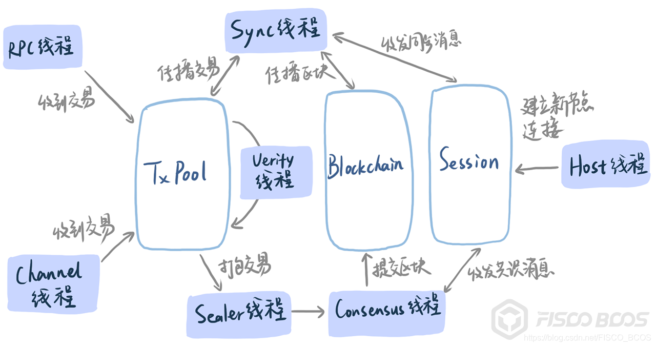 以FISCO BCOS为例,节点启动之后的关键线程以及他们之间的关系如下: