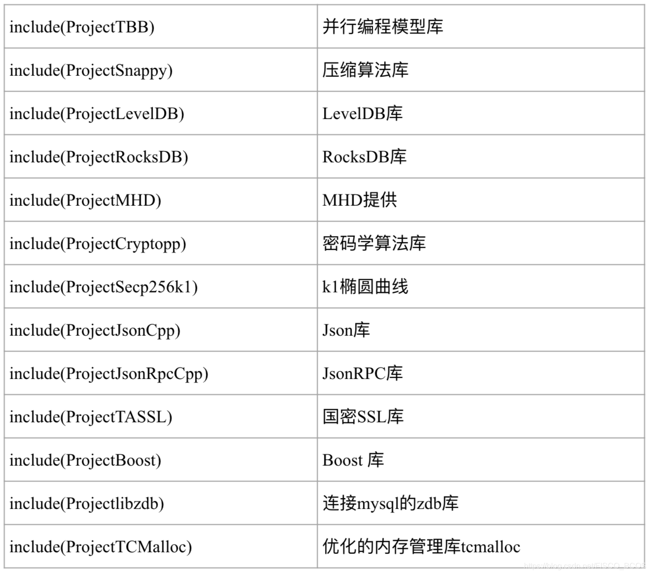 以FISCO BCOS为例,从CmakeLists.txt可以看到依赖库包括: