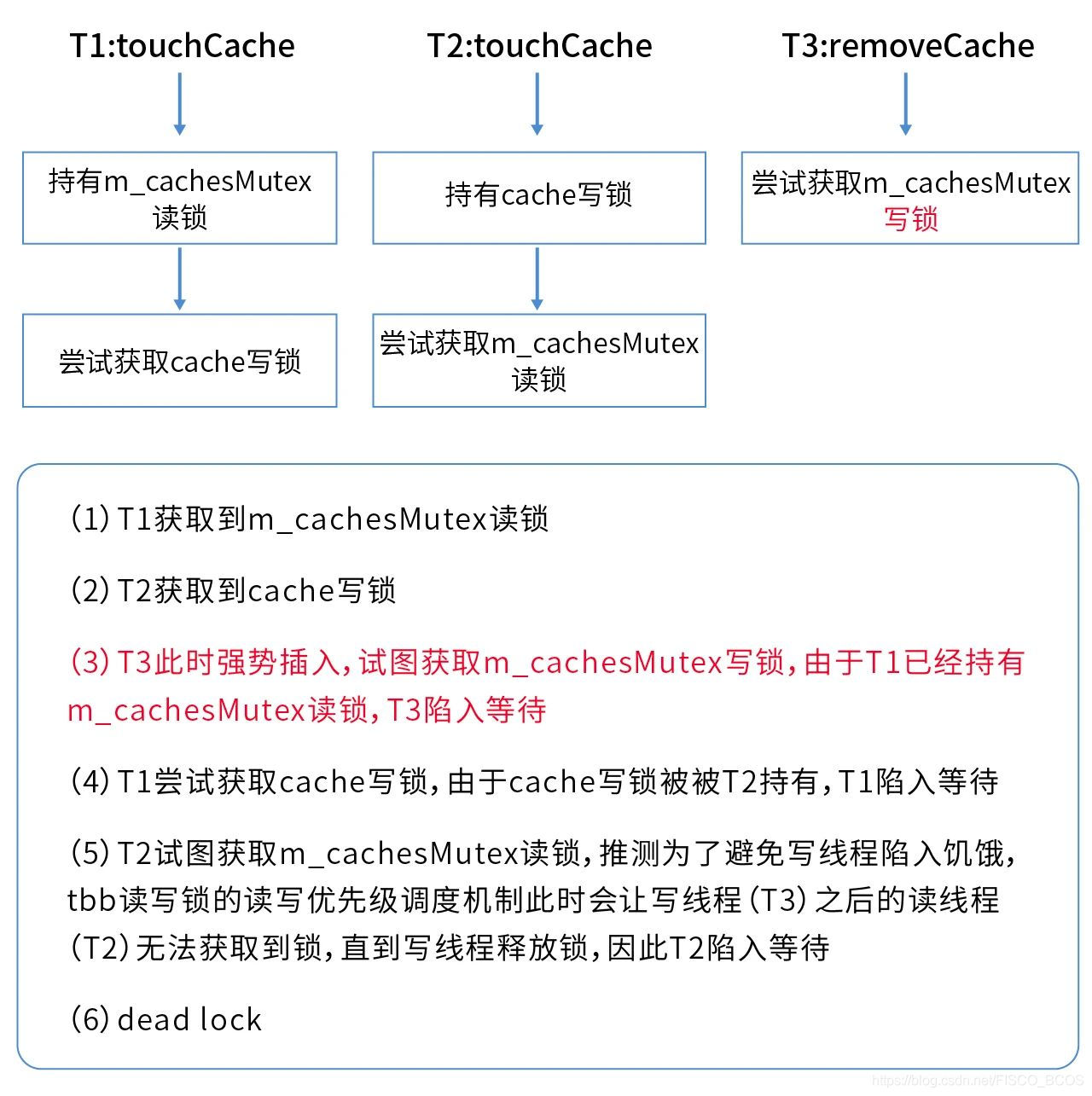 在上述问题中, T1已经获取了m_cachesMutex的读锁,若此时T3恰好获得时间片并执行到CachedStorage.cpp的第734行,会因获取不到m_cachesMutex的写锁而卡住,随后其他线程也开始执行并到了获取m_cachesMutex读锁的代码行。