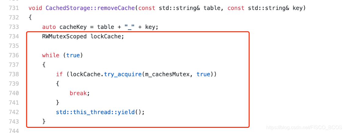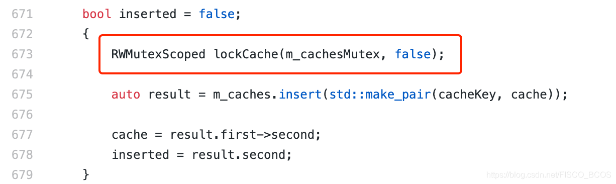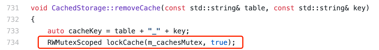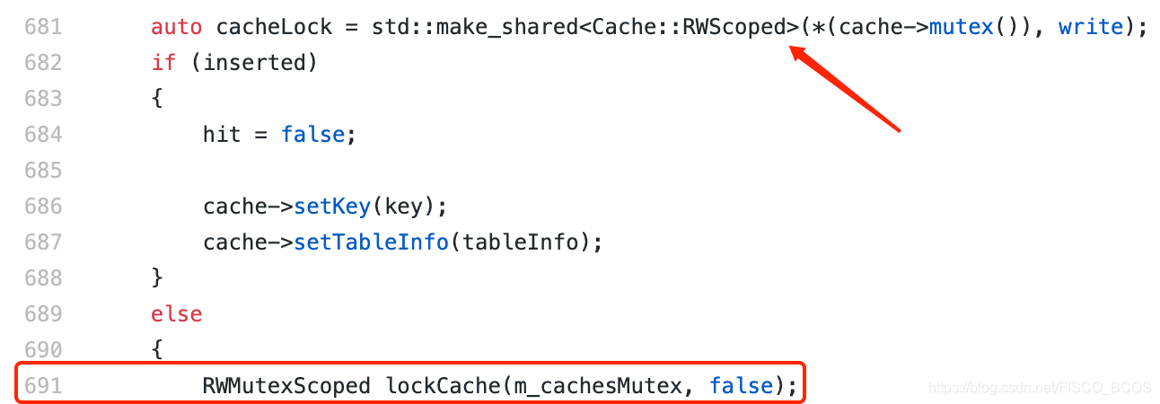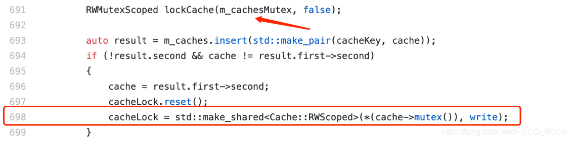 从代码片段中可以看到,T1在第691行已经获得了m_cachesMutex的读锁:代码RWMutexScoped(some_rw_mutex, false)的意思是获取某个读写锁的读锁;相应地,代码RWMutexScoped(some_rw_mutex, true)的意思是获取某个读写锁的写锁,这里的RWMutex是一个Spin Lock。