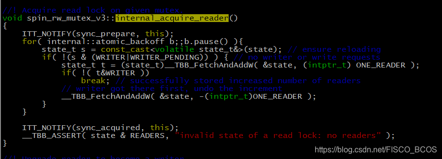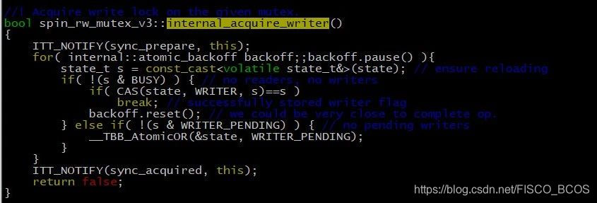 我们找到了TBB中Spin RW Lock的实现代码,如下图所示: