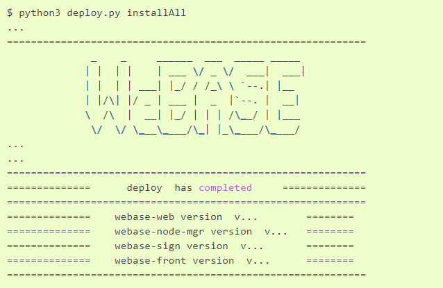 # WeBASE子系统的最新版本(lab或以上版本)webase.web.version=lab-rc1webase.mgr.version=lab-rc1webase.sign.version=lab-rc1webase.front.version=lab-rc1...# Fisco-bcos version(v3.0.0 or above)fisco.version=v3.0.0-rc1部署完成后,WeBASE的详细版本号将可输出。部署后的服务状态检查与使用方法可以参考文末提供的WeBASE的在线文档。