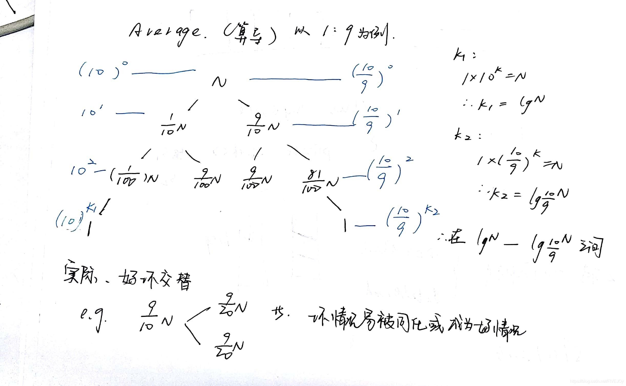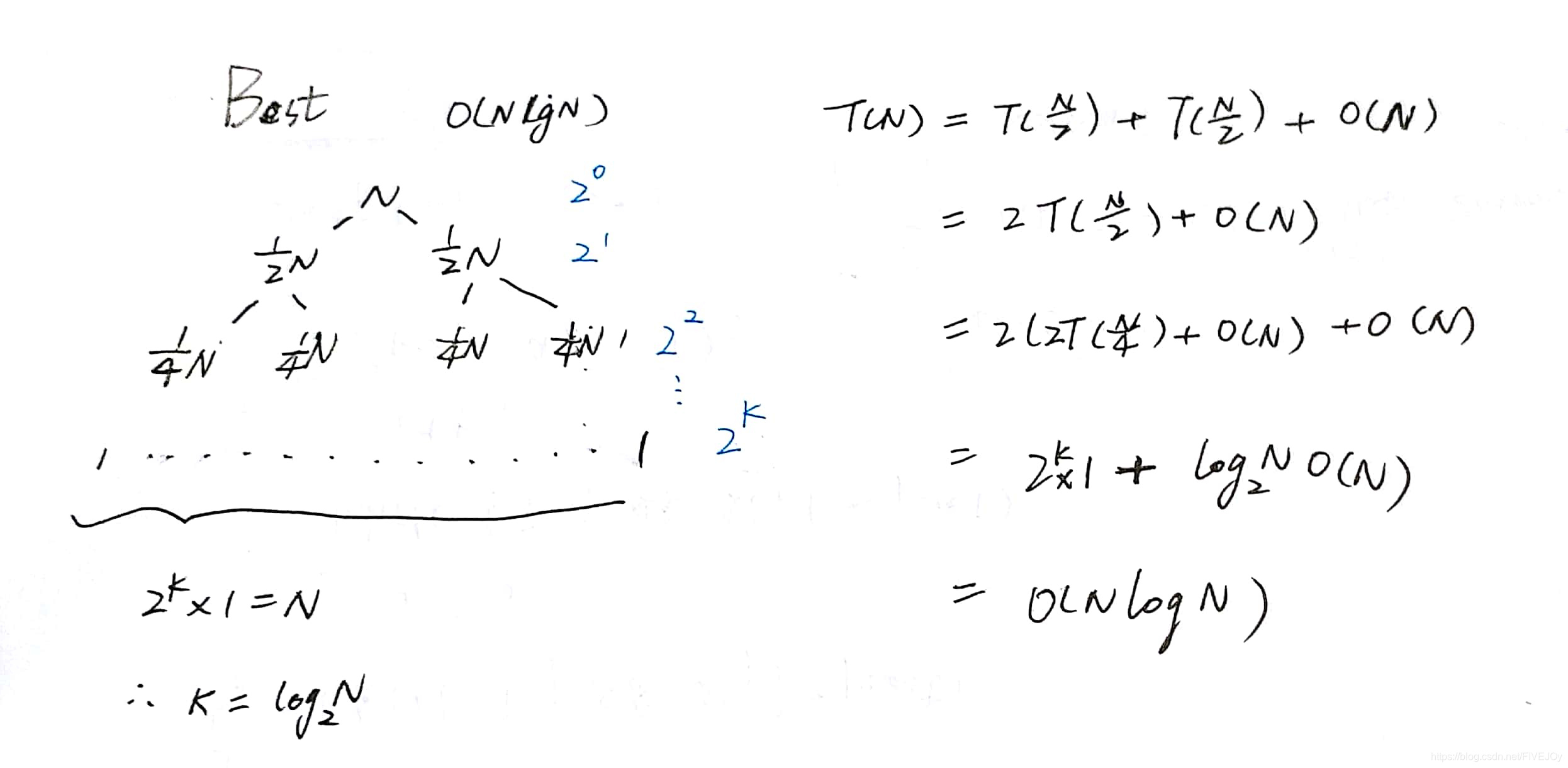 快速排序的最好情况:每次选取的主元可正好将数组a中的元素平均分成两份 每次将问题分为两个等分的问题然后向下递归T(N)=O(NlogN)