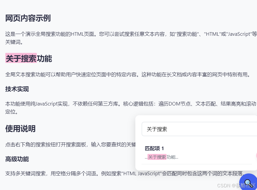 以下是实现自适应页面全局字符搜索功能的完整代码,包含悬浮窗设计和关键词高亮跳转功能: