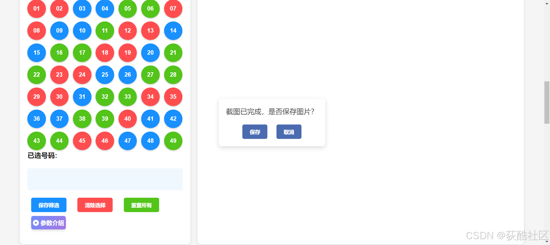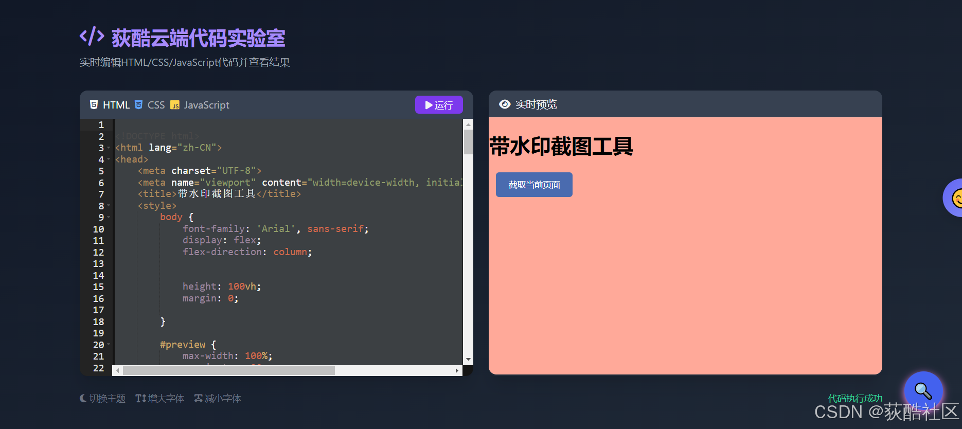 以下是实现HTML页面截屏功能的完整代码,包含截图、保存提示和下载功能: