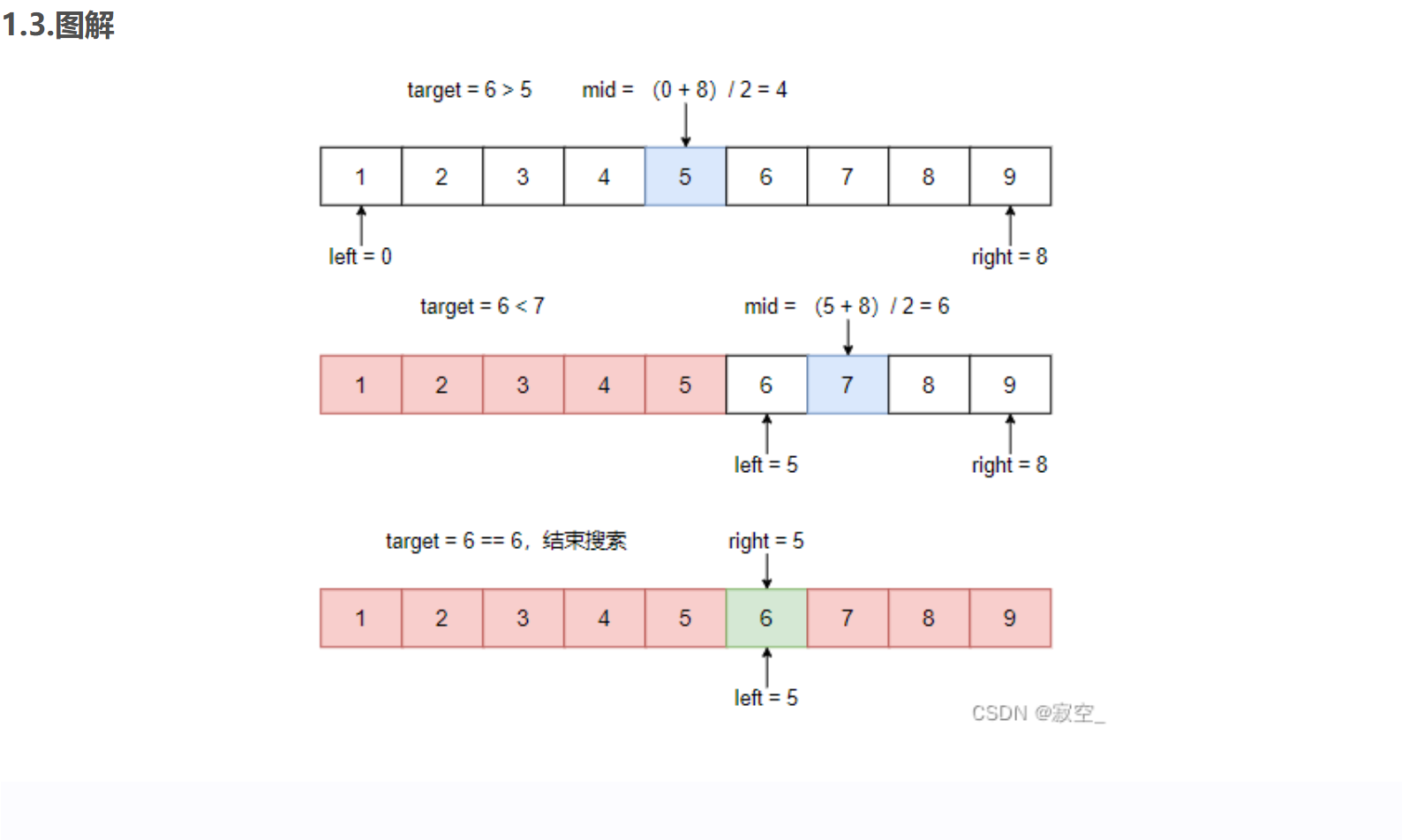 3.判断待查找的数和mid,如果等于,就直接返回mid对应的值,如果大于mid就让左值等于mid+1,如果小于就让右值等于mid-1;