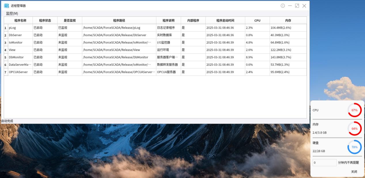 作为ForceSCADA的运行程序,通过组态配置可以设置工程运行需要启动的程序,包括ForceSCADA软件中的程序和非本软件中程序。进程管理器可以控制工程运行程序启停、监视程序的运行状态,支持程序意外退出时的重新启动。可设置密码保护,使用密码才可对运行的进程查看与管理。用于数据库服务器和采集服务器等的配置和管理,便于用户的使用。进程管理器可以进一步提高系统自身处理信息和数据安全的能力,增强预防和告警机制,避免异常事件后造成重大损失,资源监控:可以实时显示程序的路径、启动时间、CPU、内存、启停时间、运行状态等,并提供定时归档功能,便于异常分析;阈值提醒:阈值提醒开启后可以配置参数的百分比,包括CPU内存占用率、工程磁盘空间占用率等,当电脑系统的CPU、内存、磁盘空间、网络带宽等达到设定的占比时,弹出告警提示。