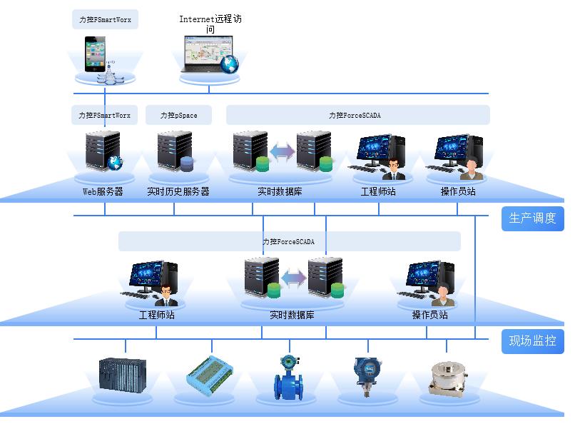ForceSCADA产品的应用架构非常灵活,支持可扩展的分层分布式应用架构,与力控其他产品如数据库产品,网关产品等配合使用,将多个站控的数据进行汇总,形成厂级或集团级的集中的调度中心监控系统。