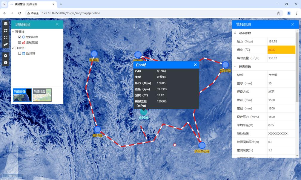 力控在线 GIS 基于先进的技术架构,可依据用户授权获取的在线地图资源,灵活开展二次组态工作。在地图上,不仅能够依据经纬度精准实现可视化站点标注、细致完成管线绘制,还能实时展示具体标注项的动态数据,全方位呈现生产现场的实时信息。