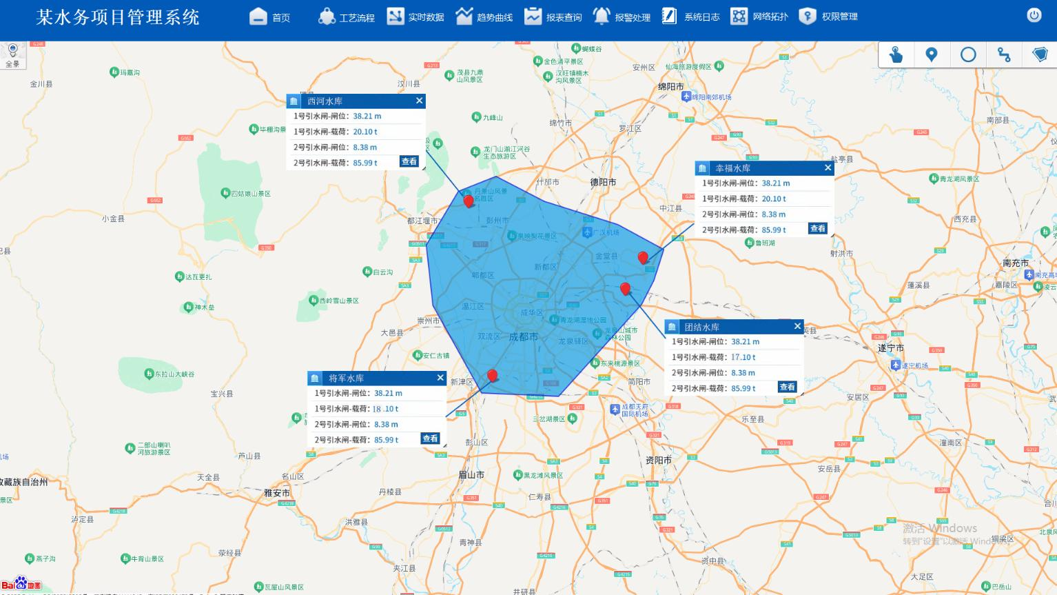 支持在地图上添加/删除点、线、面、用户自定义覆盖物等。借助该功能,可将设备实时数据以图标形式叠加于地图,并结合鼠标动作与事件实现动态展示,帮助用户直观掌握设备运行状态与数据分布。