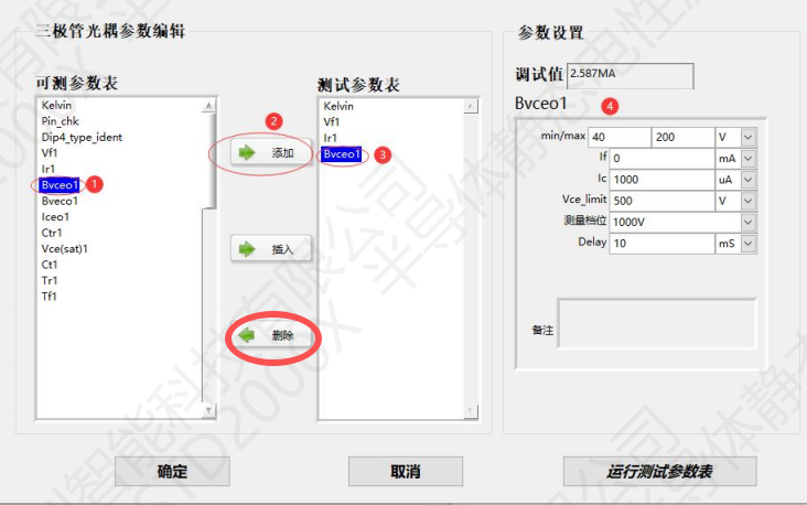 点击添加 按钮,系统将左边的可测参数加至右边测试参数表,左边窗口中列出系统可测的所有参数,双击欲选择的参数或单击欲选择的参数后点击确定按钮,即在待测参数窗口中增加了一个测试参数(在尾部),同时在右部参数编辑窗口中将显示该参数的名称,供下一步进行编辑测试参数。