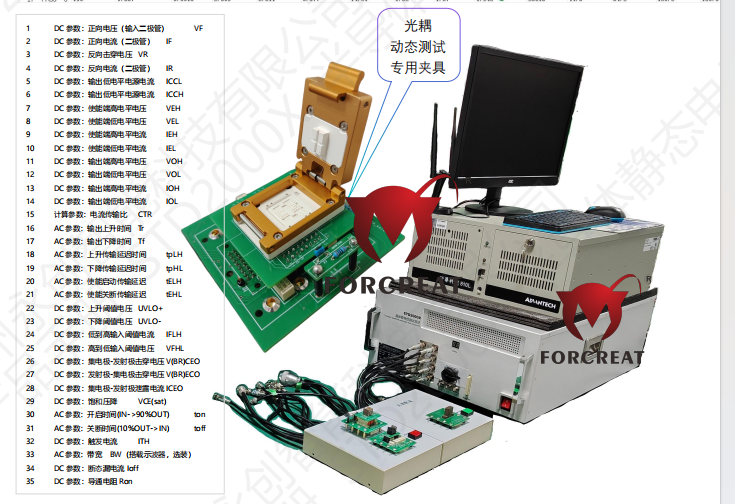 测试参数包括 BVCES、VGS(th)、RDS(on)、HFE、CTR、VF、IR 等关键指标,系统具备 pA 级微电流与 nA 级漏电流的精确测量能力,适用于高阻态、低功耗器件的测试需求。