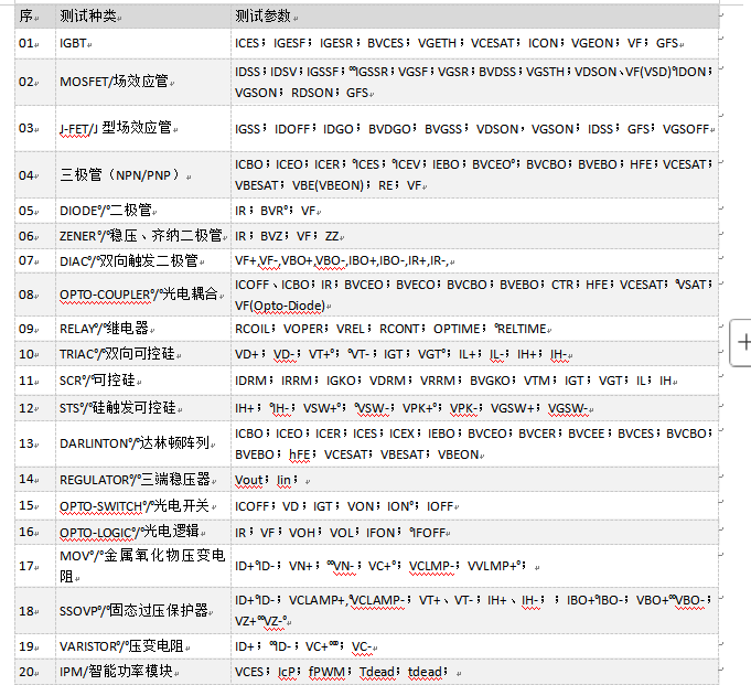 半导体静态测试参数是指在直流条件下对其进行测试,目的是为了判断半导体分立器件在直流条件下的性能,主要是测试半导体器件在工作过程中的电流特性和电压特性。静态测试参数主要有: