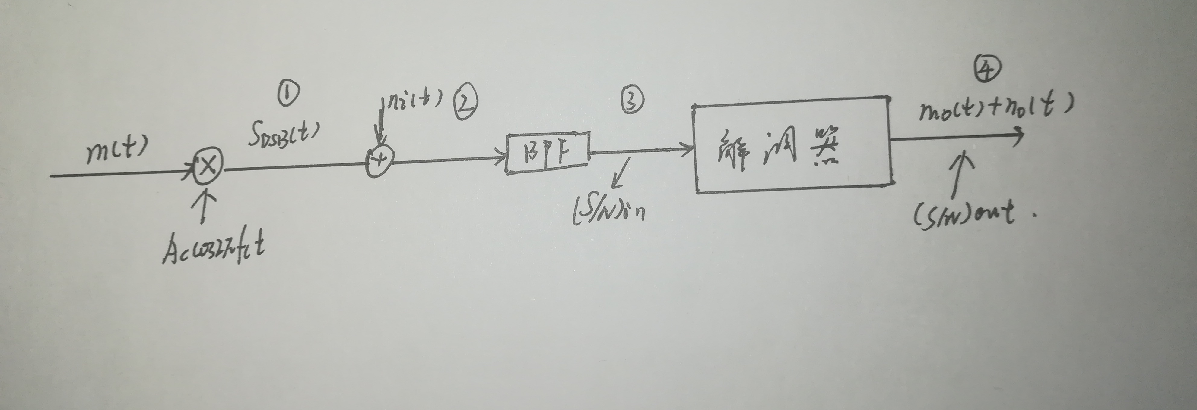 经过带通滤波器后信号: r ( t ) = s D S B ( t ) + n ( t ) (2.2.3) r(t)=s_{DSB}(t)+n(t)\tag{2.2.3} r(t)=sDSB(t)+n(t)(2.2.3)