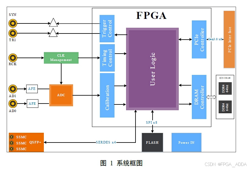 高分辨率、高采样率数字化仪模块。它具备12位的双通道5.2GS/s或单通道10.4GS/s的采集能力,全功率模拟输入带宽(-3dB)可达8GHz。采用交流耦合方式,输入阻抗50 欧姆。采用PCIe Gen3 x8通信接口,两组DDR4,每组4GB,每组位宽64bit,共8GB数据缓存空间,配合上位机硬件以及软件,可以支持单次及多次触发采集,触发采集流盘模式,可定制数字下变频、快速傅立叶变换、数字滤波等算法模块完成不同的数据采集处理需求。以下章节将详细描述各部分功能。