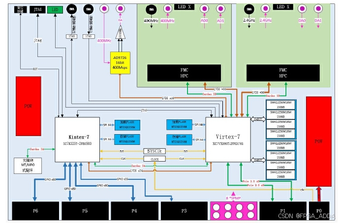 - 提供 2 路 FMC 标准(VITA 57.1)子卡接口, 每路接口包括 82 对高速差分线(含 2 对差分时钟线)、8 组共 16 对超高速 DP 差分对及2 对超高速差分时钟线