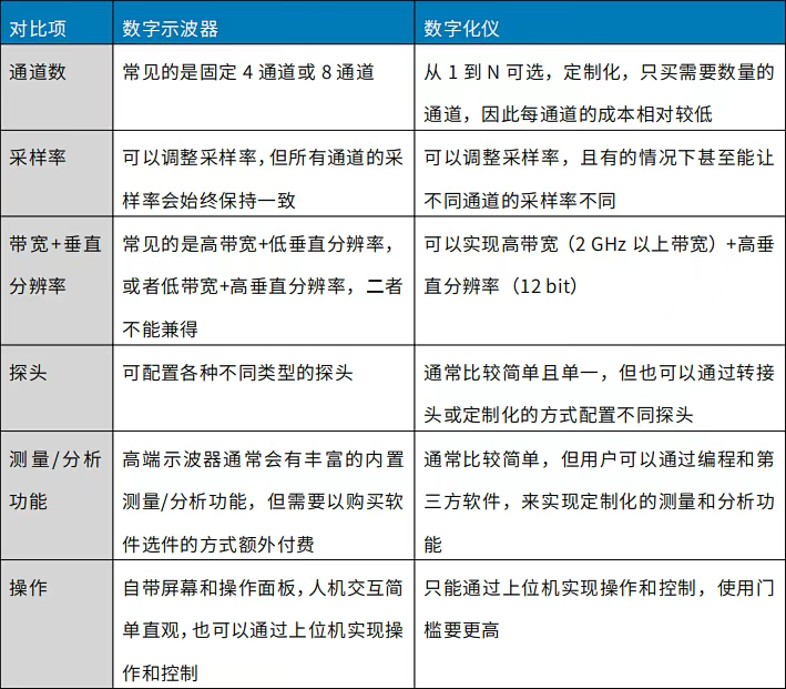 数字化仪通过适当的软件可以实现与示波器相同的功能,即采集电信号波形并在屏幕上显示出来,并且将信号的数据保存下来。事实上,数字化仪已经在不少场合完全替代了示波器的使用,尤其是在需要高采样率、高分辨率和多通道的应用中,表1给出了二者的详细对比。