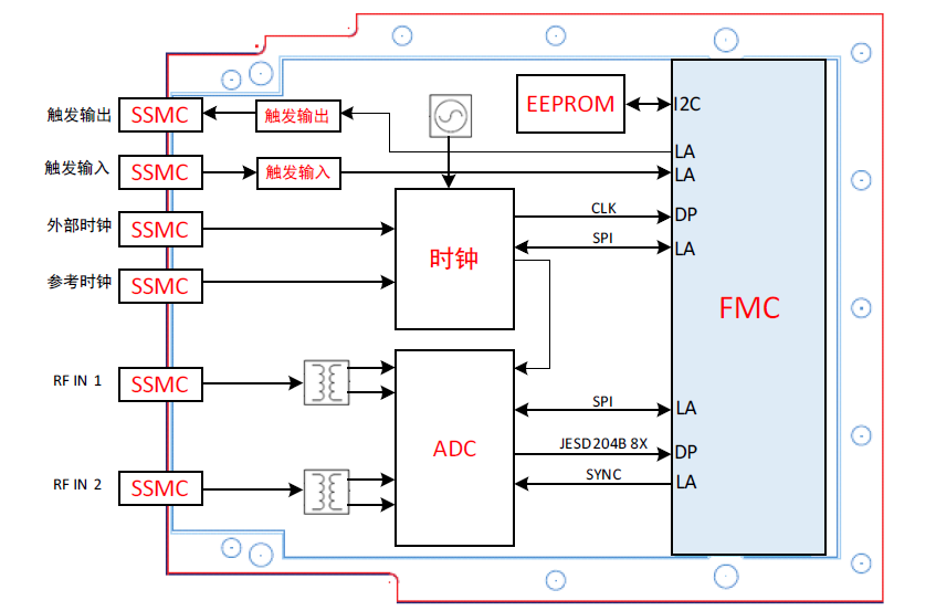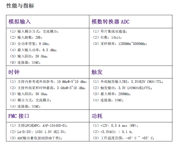 是一款2 路采样率最高为3000MSPS 的高速采集板,采样位数14bit,全功率模拟输入带宽可达到9GHz;板卡支持触发输出/触发输入;ADC 采样时钟源支持内部参考时钟、外部参考时钟、外部采样时钟三种方式,可通过SPI 总线实现时钟源选择,通过参考时钟可实现多个板卡的同步;板卡的电气与机械设计依据FMC 标准(ANSI/VITA 57.1),支持导冷,能够满足用户在特殊环境下的使用需求。