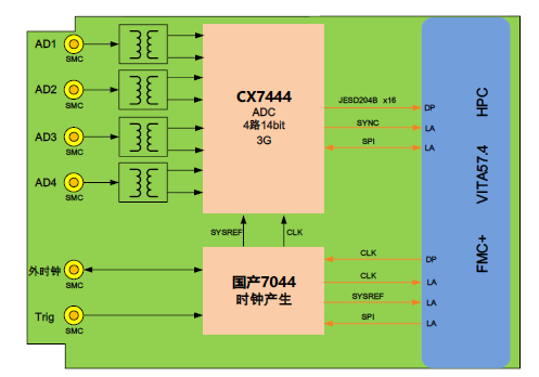 全国产FMC/FMC+ 4 通道3G 14 位AD 采集子卡(100%国产率),基于VITA57.4 标准规范的JESD204B 接口全国产化FMC/FMC+子卡模块,该模块可以实现4 路14bit、3GSPSADC 采集功能。该ADC 与FPGA 的主机接口通过16 通道的高速串行收发器。
