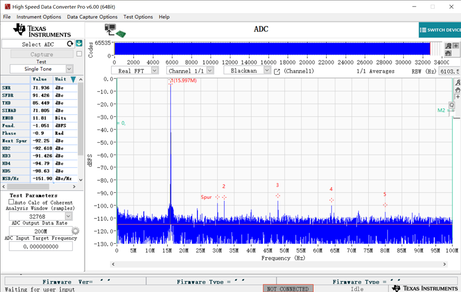 该板卡每路ADC采集通道的实测采集指标信噪比(SNR)和无杂散动态范围(SFDR)与芯片手册指标标称值基本一致,可实现优异的采集性能。