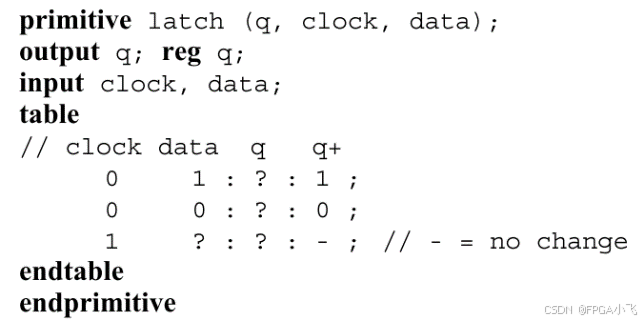 电平敏感的时序行为表示方法与组合行为相同,其输出被声明为reg类型,并且每行表项中都有一个额外字段,这个新字段表示 UDP 的当前状态。时序式UDP的输出字段代表下一个状态。