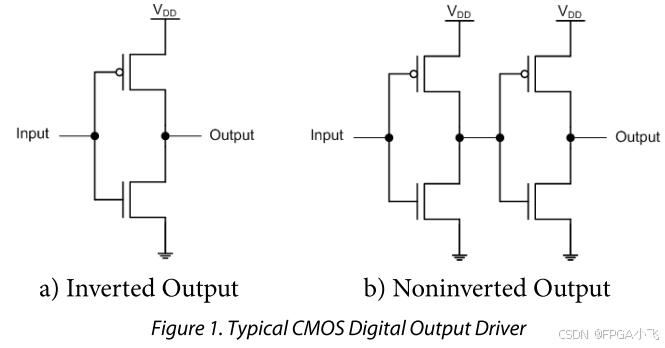 1a这种结构的CMOS接口会导致输出信号与输入信号的高低电平反相,称为CMOS反相驱动器,为了使用方便,使输入/输出信号同相,因此在第一级CMOS反相输出器后面又加了一级CMOS反相器,衍生出了1b所示的CMOS同相输出驱动器。