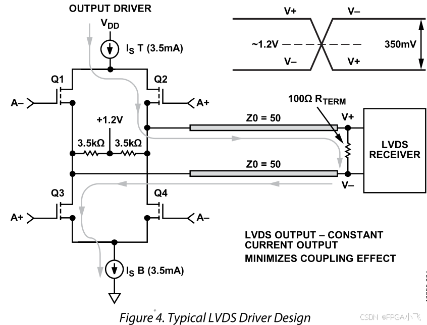 我们从图中可以看到,LVDS接口连接负载后,会始终存在一个固定的直流负载电流,无论VDD是3.3V、2.5V还是1.8V,该电流在100Ω的负载端总是会形成一个典型值在1.2V左右的直流共模电压。当输入的信号电平高低变换时,3.5mA的恒流源会在100Ω负载端形成±350mV的交流摆幅。