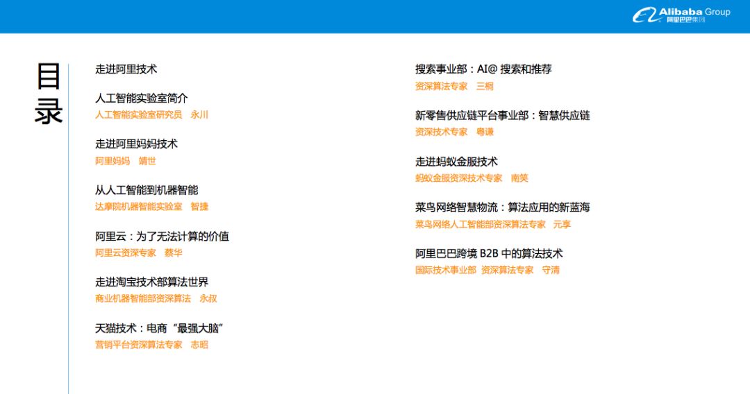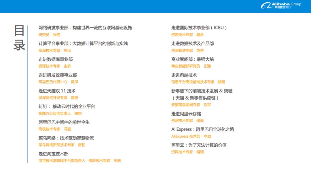 阿里首次将技术体系全面对外公开:从人工智能到机器智能,从世界一流的互联网基础设施到大数据计算平台、智慧物流运维等标杆技术,从前端到研发效能,基本涵盖了阿里巴巴所有技术兵种,内容涉及业务框架、核心架构、优化算法等。