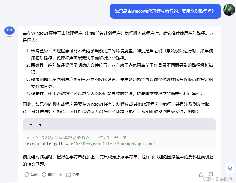 如果你的脚本或程序需要在Windows任务计划程序或其他代理程序中执行,并且涉及到文件路径,最好使用绝对路径。这样可以确保无论在什么环境下执行,都能准确找到目标文件。
