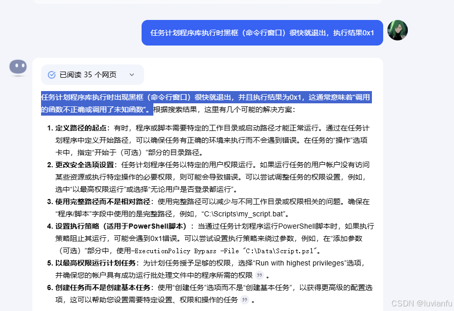 2、用电脑自带的任务计划跑工具时,命令行窗口闪现了下,很快就退出了,看不到报错信息,看执行结果码0x1,应该是程序出错了
