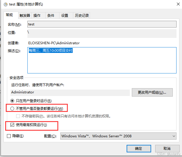 尝试选择“不管用户是否登录都要运行”,勾选“使用最高权限运行”