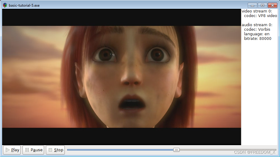 本教程将打开一个GTK+窗口并显示一个电影,并附带音频。媒体是从Internet获取的,因此窗口可能需要几秒钟才能显示,具体取决于您的连接速度。窗口中有一些GTK+按钮,用于播放,停止和播放电影,还有一个滑块用于显示流的当前位置,可以拖动以更改它。此外,有关流的信息显示在窗口右边缘的一列上。