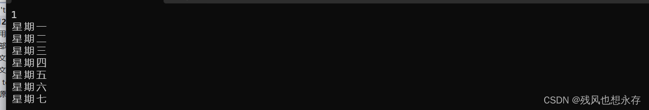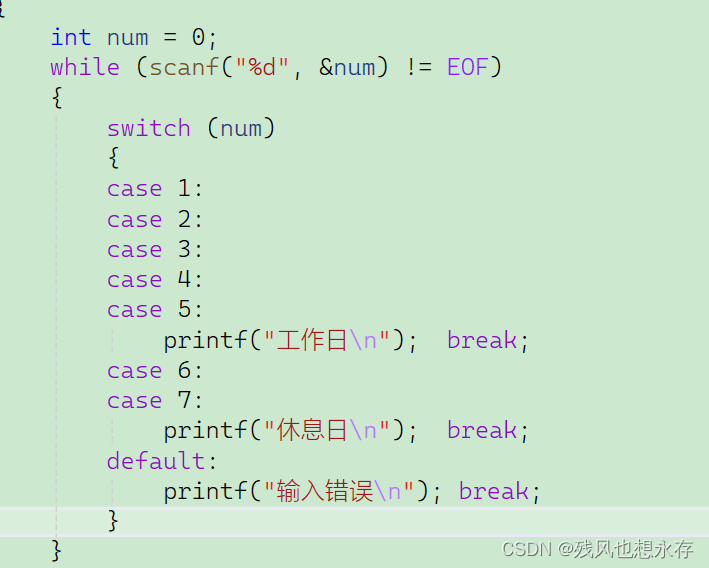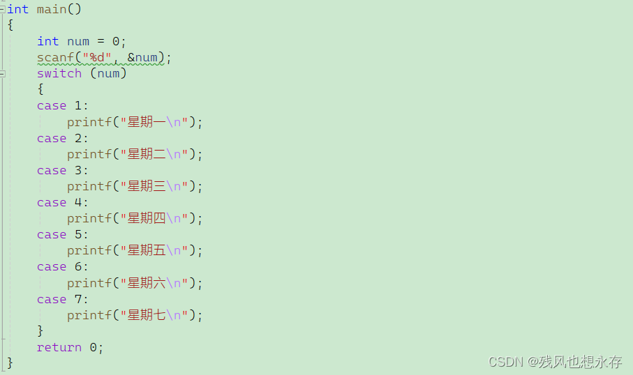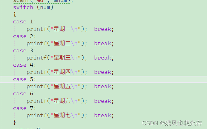 若要表示多分支的逻辑,用多个case即可完成。要特别注意的是,switch中的表达式必须是整型类型,case后面的则必须是整型类型的常量。下面举个例子:(输入一个数,然后打印出来对应的一周的哪一天)