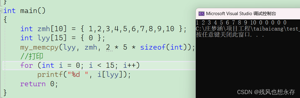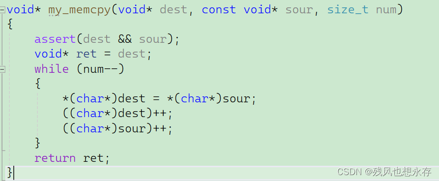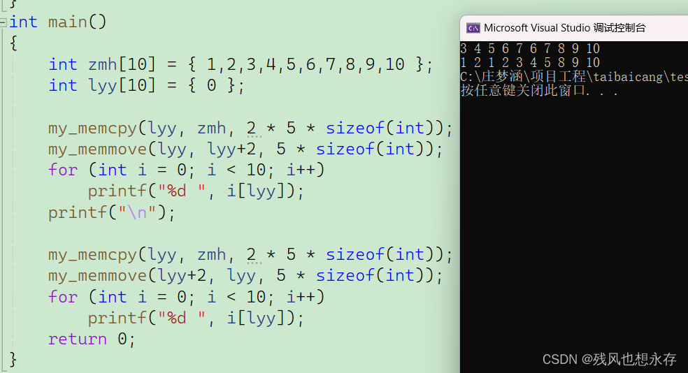 void* my_memmove(void* dest, void* sour, size_t num) { assert(dest && sour); void* ret = dest; if (dest < sour) { while (num--) { *(char*)dest = *(char*)sour; ((char*)dest)++; ((char*)sour)++; } } else { while (num--) ((char*)dest)[num] = ((char*)sour)[num]; } return ret; } - 效果展示: