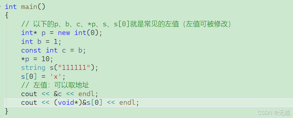 - 左值:可以取地址,可以出现在赋值操作符的左端和右端,通常是变量和解引用的指针,其具有持久性——所有可以定位的值(可以进行取地址操作)