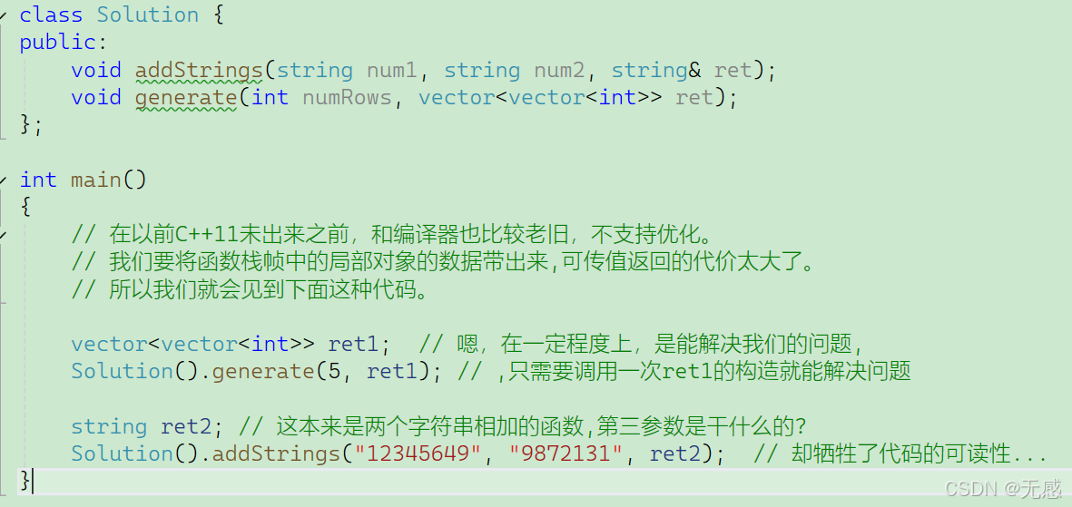 - 这样的代码,确实解决了拷贝次数过多的问题,在一定程度了提高了程序的性能。但是代码的可读性却受到了当头一棒。如果在当时那个历史背景下,C++委员会无作为,编译器也不做任何改进。可能也只好为了效率去舍弃代码的可读性了。