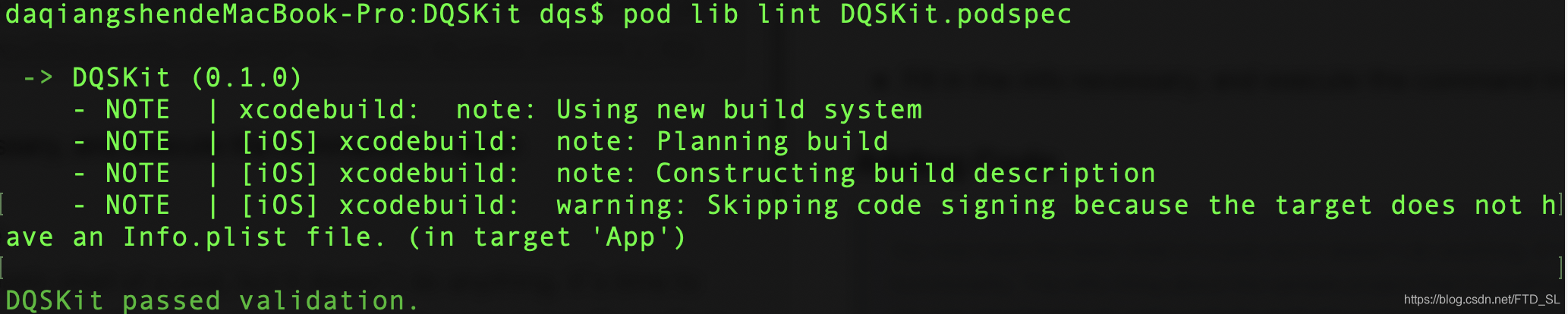 Next, run the following command from the command line to verify that everything is configured correctly between where your source code is stored and your .podspec file:pod spec lint DQSKit.podspec