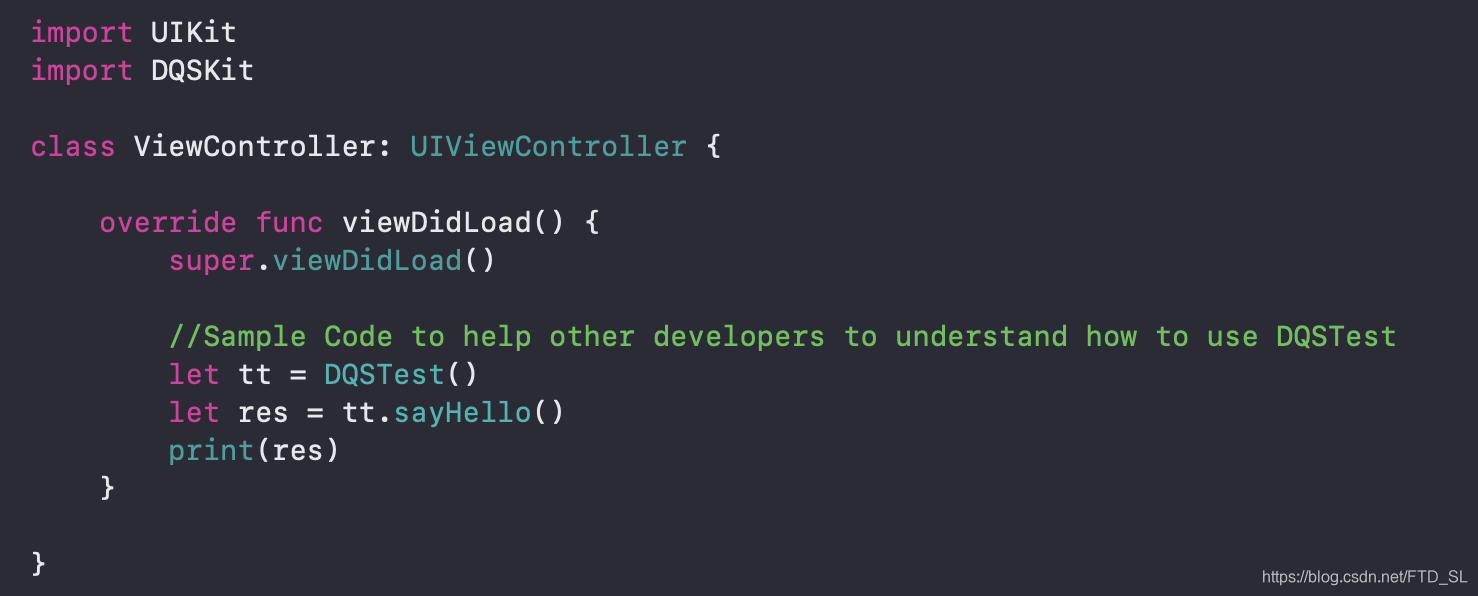 To ensure it’s easy for other developers to understand how to use DQSKit, add some sample code to the example project. Open DQSKit/Example/DQSKit/ViewController.swift and make it look like this: