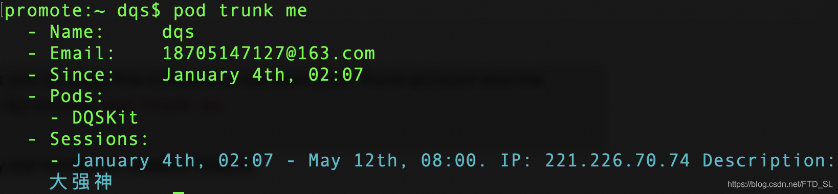 CocoaPods Trunk is an authentication and CocoaPods API service. To publish new or updated libraries to CocoaPods for public release you will need to be registered with Trunk and have a valid Trunk session on your current device.pod trunk register 18705147127@163.com 'dqs' --description='大强神'You must click a link in an email Trunk sends you to verify the connection between your Trunk account and the current computer. You can list your sessions by running pod trunk me.