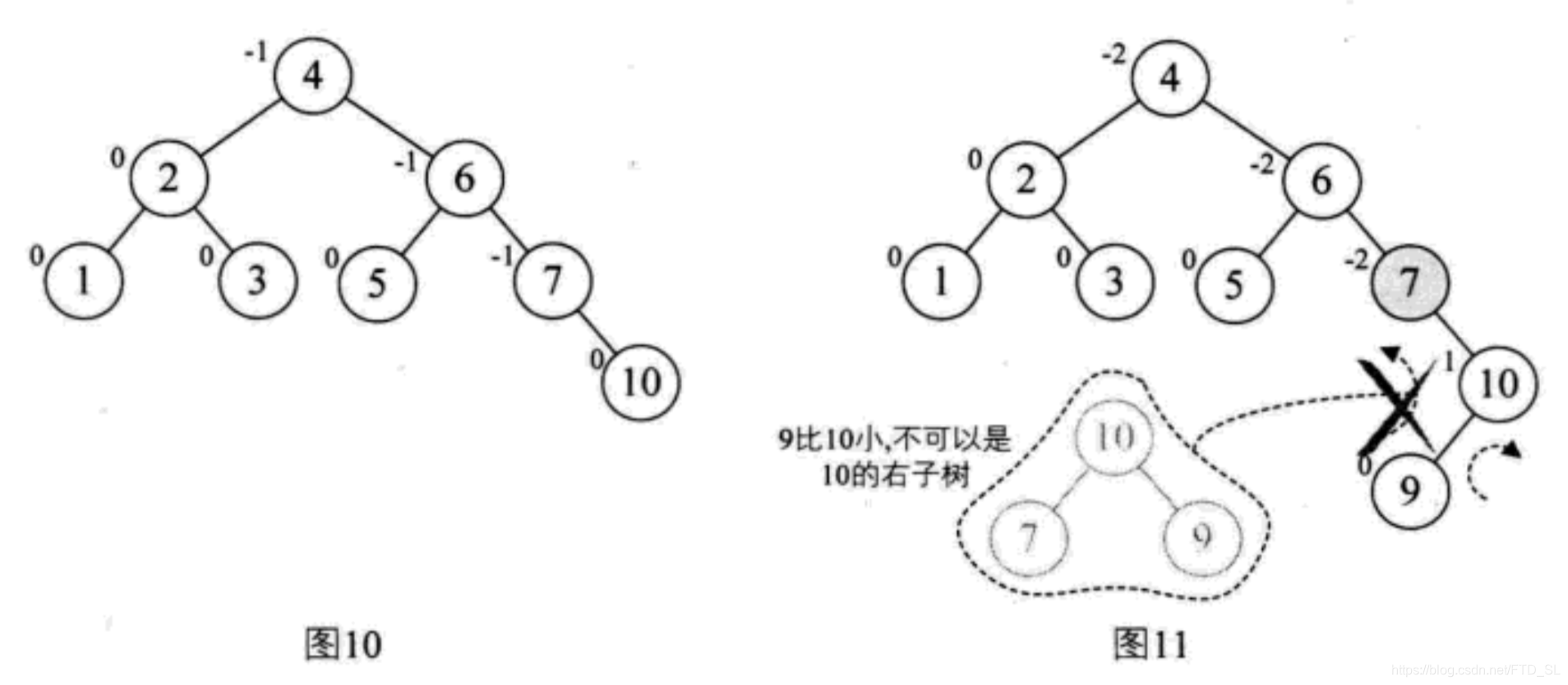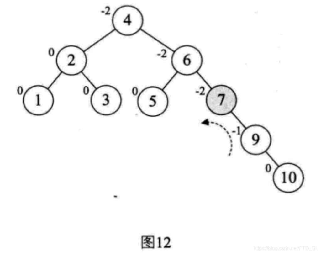 - 继续增加结点,当增加结点9时,此时结点7的BF变成了-2,理论上我们只需要旋转最小不平衡子树7、9、10即可,但是如果左旋转后,结点9变成了10的右孩子,这是不符合二叉排序树的特性的,此时不能简单地左转,如图11。