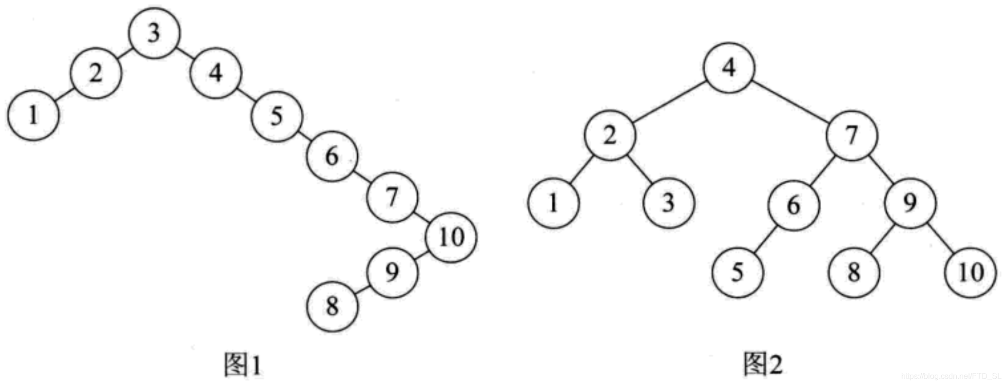 - 假设我们现在有一个数组[3,2,1,4,5,6,7,10,9,8]需要构建二叉排序树。在没有学习平衡二叉树之前,根据二叉树的特性,我们会将其构建成图1所示的样子。虽然它完全符合二叉排序树的定义,但是对这样高度达到8的二叉树来说,查找是非常不利的。而图2的平衡二叉树,高度为4,提供了更高效的查找效率。