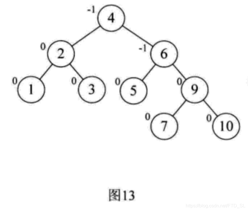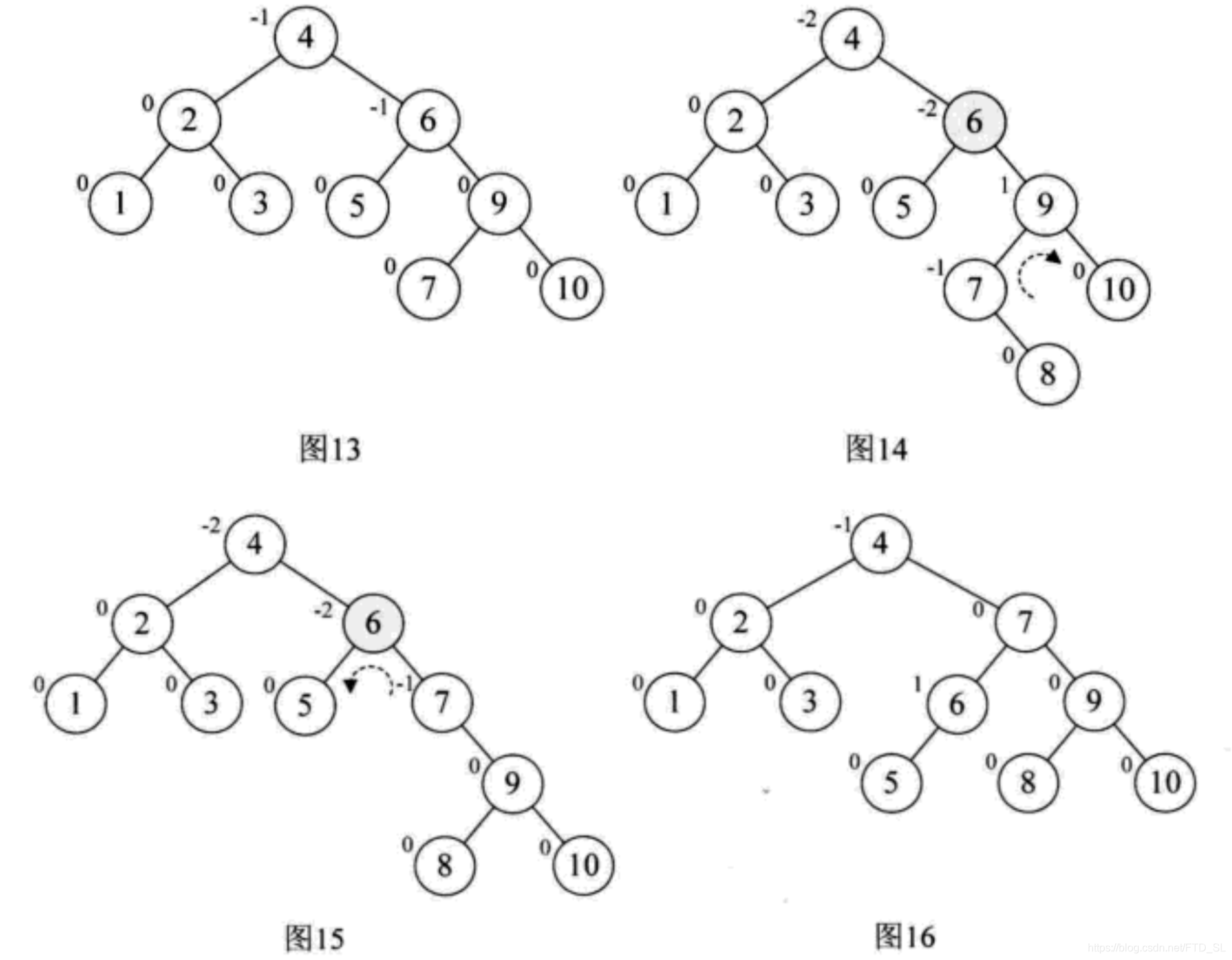 - 仔细观察图11,发现根本原因在于结点7的BF是-2,而结点10的BF是1,两者一正一负,符号不统一,而前面的几次旋转,无论左旋还是右旋,最小不平衡子树的根结点与它的子结点符号都是相同。所以我们先对结点9和结点10进行右旋,使得结点10成了9的右子树,结点9的BF为-1,此时就与结点7的BF值符号统一了,如图12。然后我们再以结点7为最小不平衡子树进行左旋,如图13。
