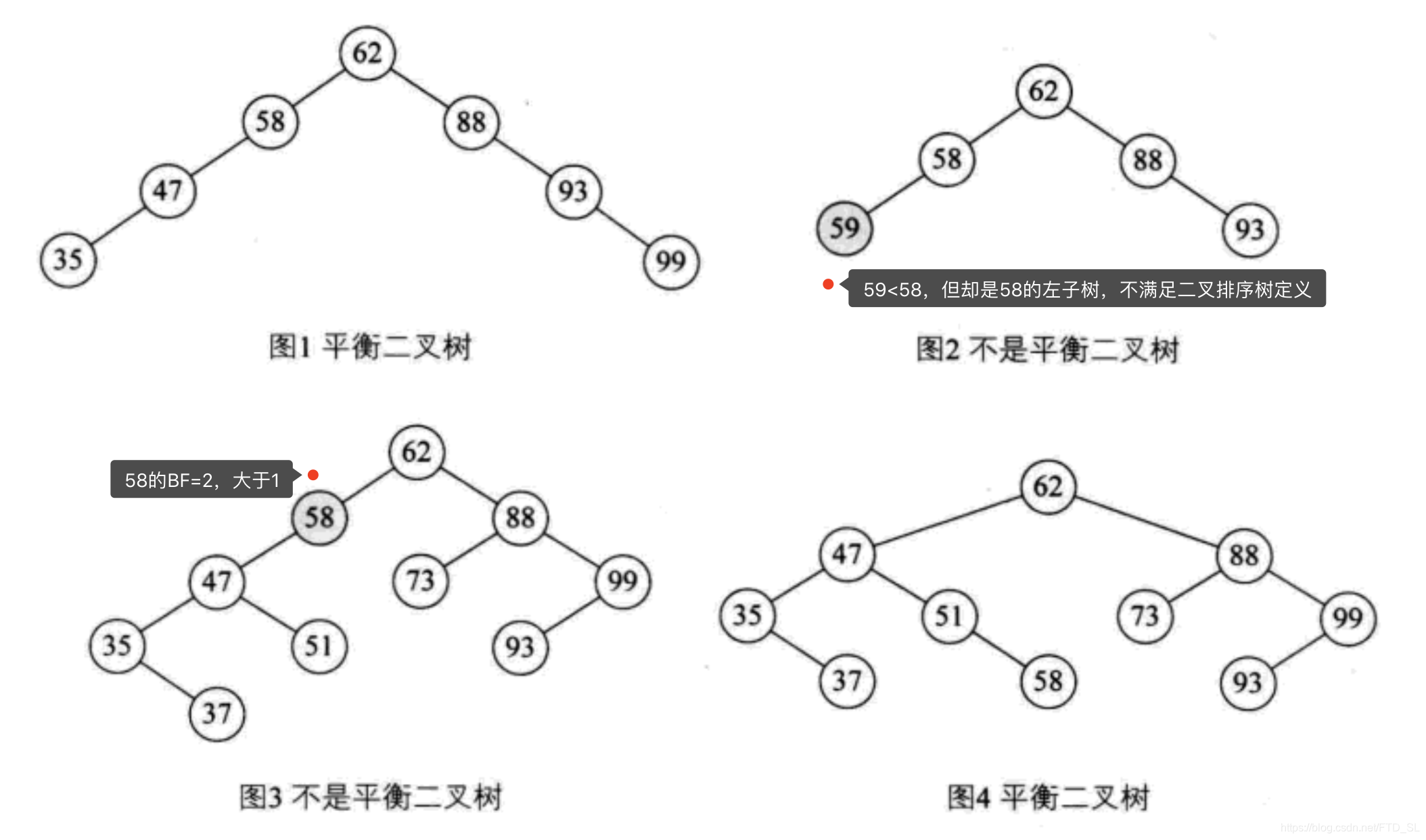 我们将二叉树上结点的左子树深度减去右子树深度的值称为平衡因子BF(Balance Factor),那么平衡二叉树上所有结点的平衡因子只可能是-1、0和1。只要二叉树上有一个结点的平衡因子的绝对值大于1,那么该二叉树就是不平衡的。