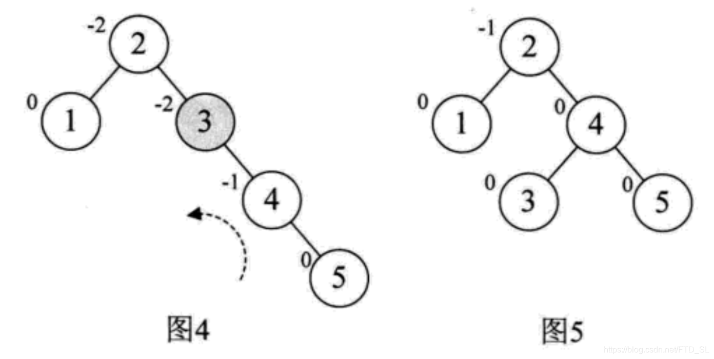 - 然后我们再增加结点4,平衡因子没发生改变,如图3。增加结点5时,结点3的BF值为-2,说明要旋转了。由于BF值是负值,所以我们对这棵最小不平衡子树进行左旋(逆时针旋转),如图4,此时我们整个树又达到了平衡,如图5。
