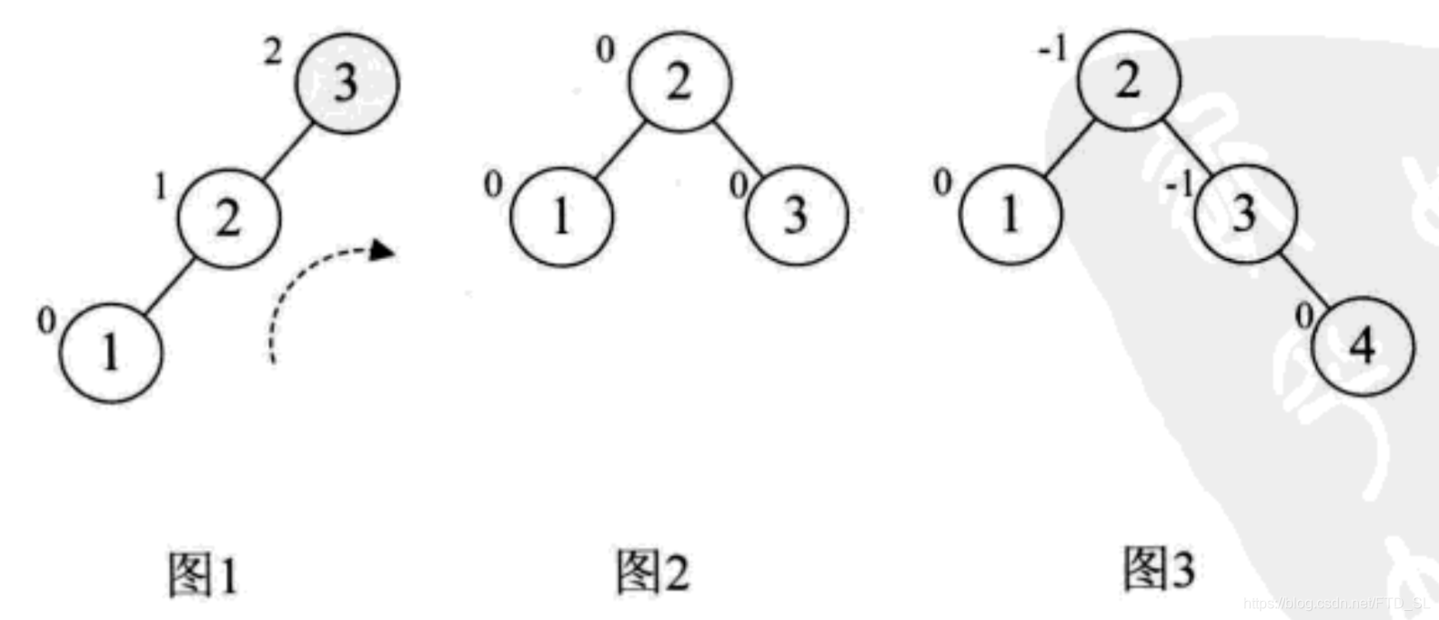 - 对于数组的前两位3和2,我们很正常地构建,到了第3个数“1”时,发现此时根结点“3”的平衡因子变成了2,此时整棵树都成了最小不平衡子树,因此需要调整,如图1(结点右上角数字为平衡因子BF值)。因为BF值为正,因此我们将整个树右旋(顺时针旋转),此时结点2成了根结点,3成了2的右孩子,这样三个结点的BF值均为0,非常的平衡,如图2。
