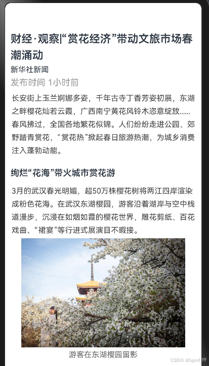 Text('3月的武汉春光明媚,超50万株樱花树将两江四岸渲染成粉色花海。在武汉东湖樱园,游客沿着湖岸与空中栈道漫步,沉浸在如烟如霞的樱花世界,雕花剪纸、百花戏曲、“裙宴”等行进式展演目不暇接。')