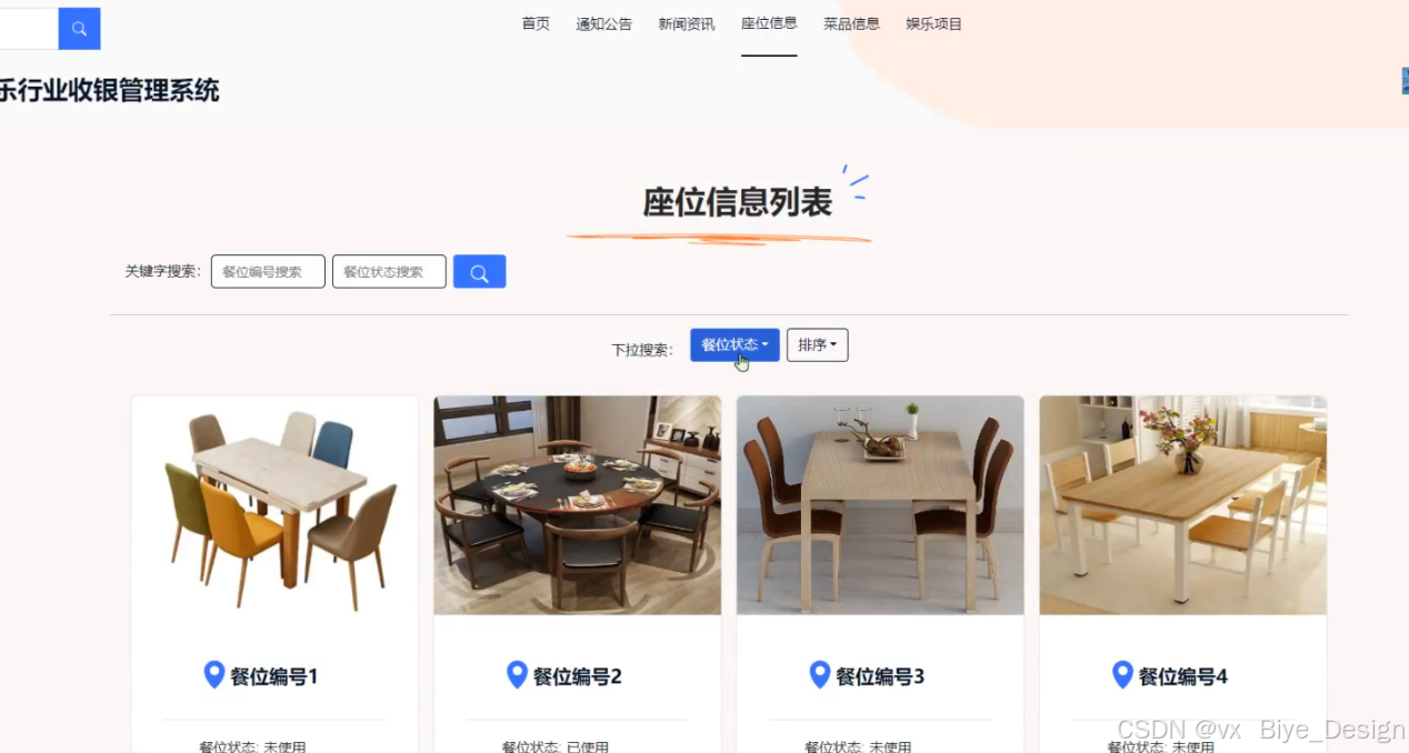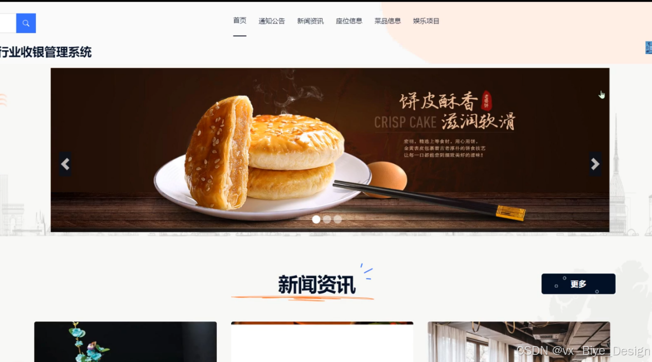 当进入基于springboot 餐饮娱乐行业收银管理系统的时候,可以看到系统中的导航栏,轮播图、新闻咨讯、座位信息、菜品信息、娱乐项目等信息,其主界面展示如下图5-9。