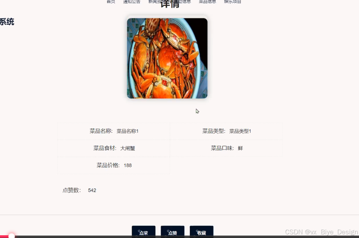 菜品信息:用户点击可查看相关菜品的详细信息,包括:菜品名称、类型、食材、口味价格等信息,用户可以进行点赞收藏以及直接点菜处理。界面如下图5-11所示。