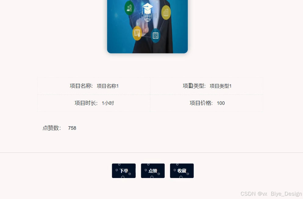 娱乐项目:用户点击可查看具体的娱乐项目详细详细,包括:项目名称、类型、时长、价格、点赞数等,也可以点赞收藏以及直接下单处理。界面图如下5-12所示。